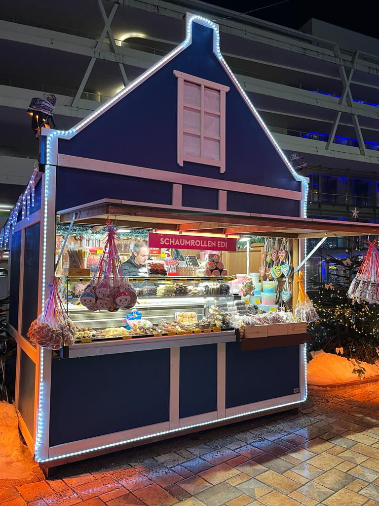 In der Regel haben unsere Markthütten ein Satteldach. Wenn Hütten aber zum Beispiel durch besondere Giebel auffallen sollen, eignen sich Hütten mit Pultdächern.